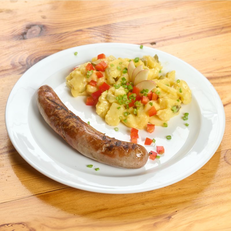 Bio-Vesper *: 1 Bratwurst (Schwein/Rind-Mischwurst) oder veganes Tempeh mit hausgemachtem Kartoffelsalat oder 1 großer Handkäse, Brot und Butter. Dazu erhaltet Ihr je 1 Glas Hausschoppen oder Apfelsaft.