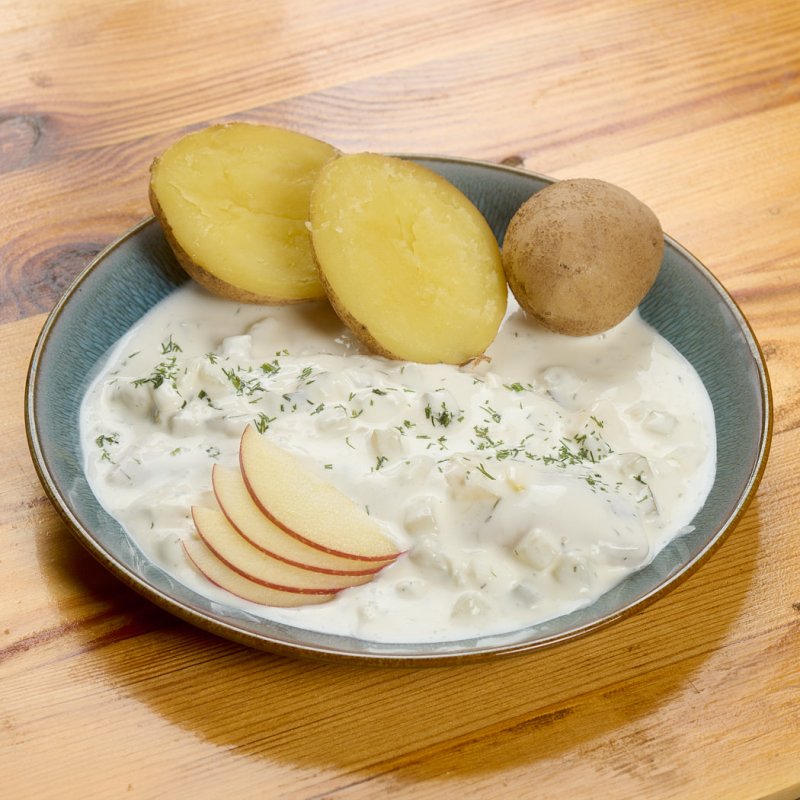 13,50 € p.P.  – enthält ein Heringsfilet in hausgemachter Bio-Apfel-Sahne mit Bio-Pellkartoffeln.