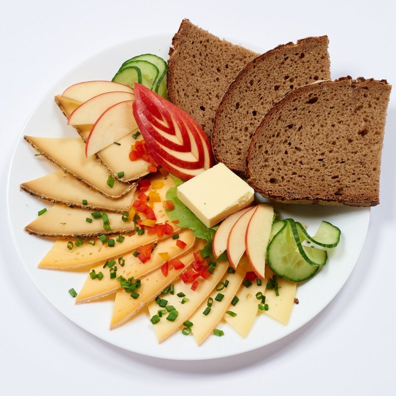 Bio-Vesper*: 1 Schweine-Rind-Bratwurst mit Kartoffelsalat, Brot und Butter oder 1 Käsetrio mit Wildblumenkäse, Brot und Butter und Mineralwasser oder vegan: 1 Cevapcici mit Kartoffelsalat.